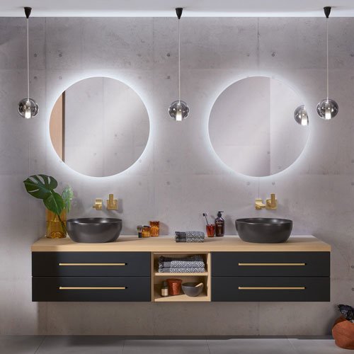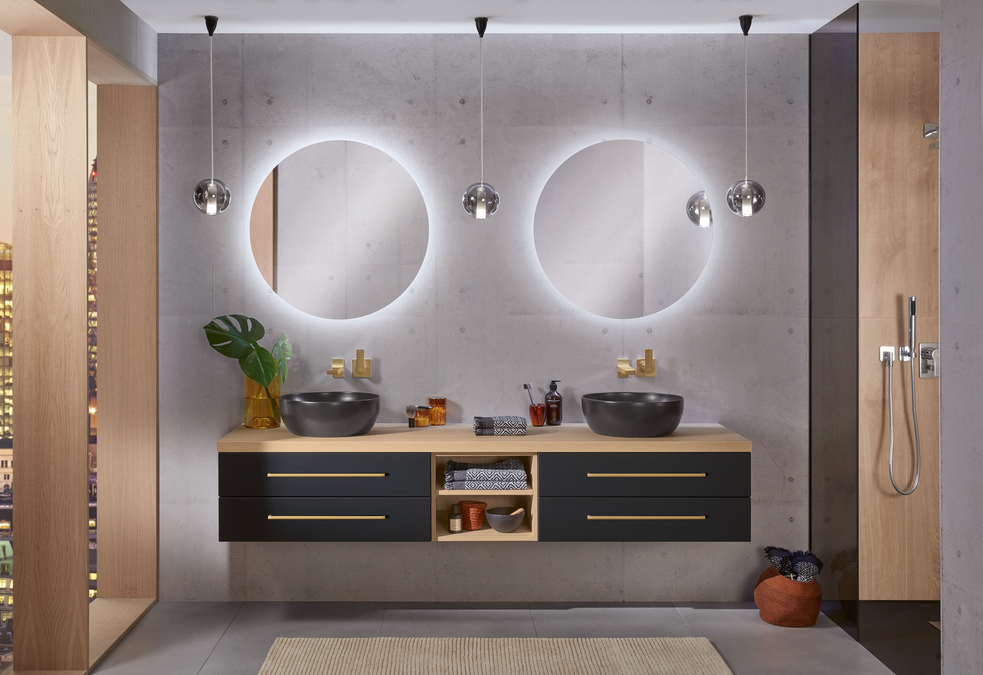 Der symmetrische Doppelwaschplatz mit vier Auszügen und offenem, breitenvariablen Regal bietet spielend Platz für zwei. Seine pflegeleichte, schwarz matte Oberfläche mit Anti-Fingerprint-Effekt steht in gekonntem Kontrast zum hellen Holzton der 2morrow Platte Slim. Einen edlen Touch verleihen die Griffe in Gold Matt mit dazu passenden Wandarmaturen. Die beiden auffälligen, runden Reflection Lichtspiegel LOLA sorgen für stimmungsvolles Licht, das per Raumschaltung bedient wird.