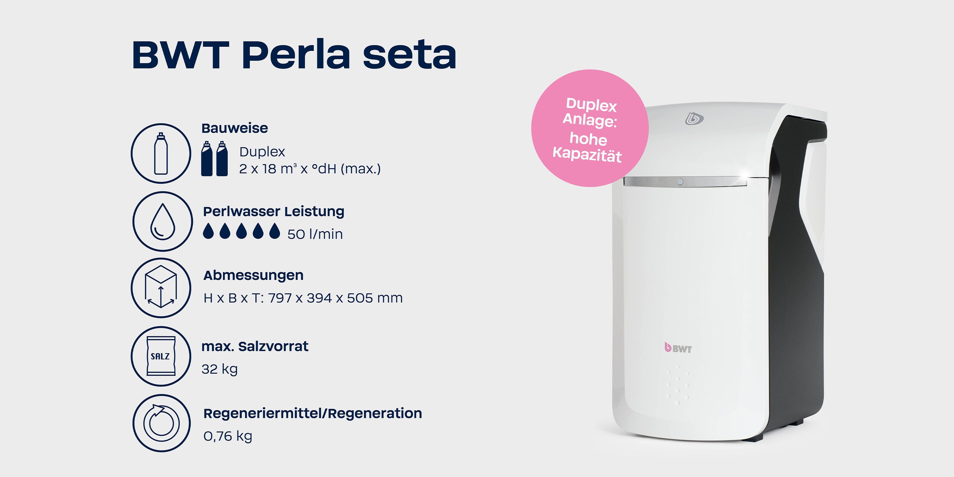 Die Enthärtungsanlagen von BWT verwandeln selbst sehr hartes Wasser in seidenweiches Perlwasser, das im gesamten Haus zur Verfügung steht. Je nach Modell sorgen Simplex- oder Duplexsysteme dafür, dass auch bei höherem Wasserbedarf jederzeit aufbereitetes Wasser zur Verfügung steht.