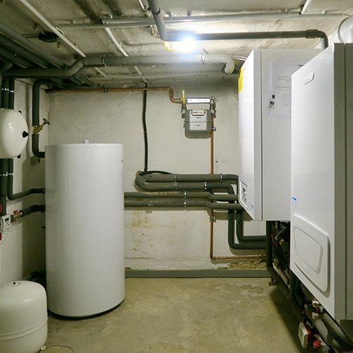 Angesichts der niedrigen Wärmepumpen-Heizleistung von 6 kW ist klar, dass der 15 kW leistende Gas-Brennwertkessel WGB EVO 15i nicht nur als „Reservegerät“ bei besonders hoher Wärme- und Temperaturanforderung zum Einsatz kommt, sondern während der wirklich kalten Monate als vollwertige Ergänzung benötigt wird. Sein hochwertiger Aluminium-Silizium-Wärmetauscher macht den kompakten Wandheizkessel überaus langlebig, der breite Modulationsbereich von 2,9 bis 15 kW sorgt für kontinuierlich angepassten Betrieb, sodass auch hier häufiges Takten vermieden wird. Den Heizkessel zeichnet überdies ein hoher Normnutzungsgrad von 109 % aus, und die selbstkalibrierende Verbrennungsregelung EVO mit OptiMix-Vormischkanal ermöglicht den Einsatz mit allen drei Gasarten (E, LL und Flüssiggas).