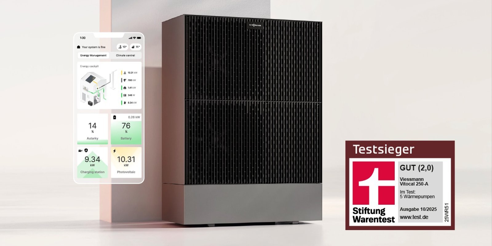 Die Luft-/Wasser-Wärmepumpe Vitocal 250-A (10 kW) wurde in der Ausgabe 10/2025 von Stiftung Warentest erneut zum Testsieger gekürt. Sie überzeugt mit Bestnote 1,0 in der Handhabung, hoher Effizienz, niedrigem Stromverbrauch und extrem leisem Betrieb. Ideal für die Modernisierung von Bestandsgebäuden mit zukunftssicherer Vernetzung.